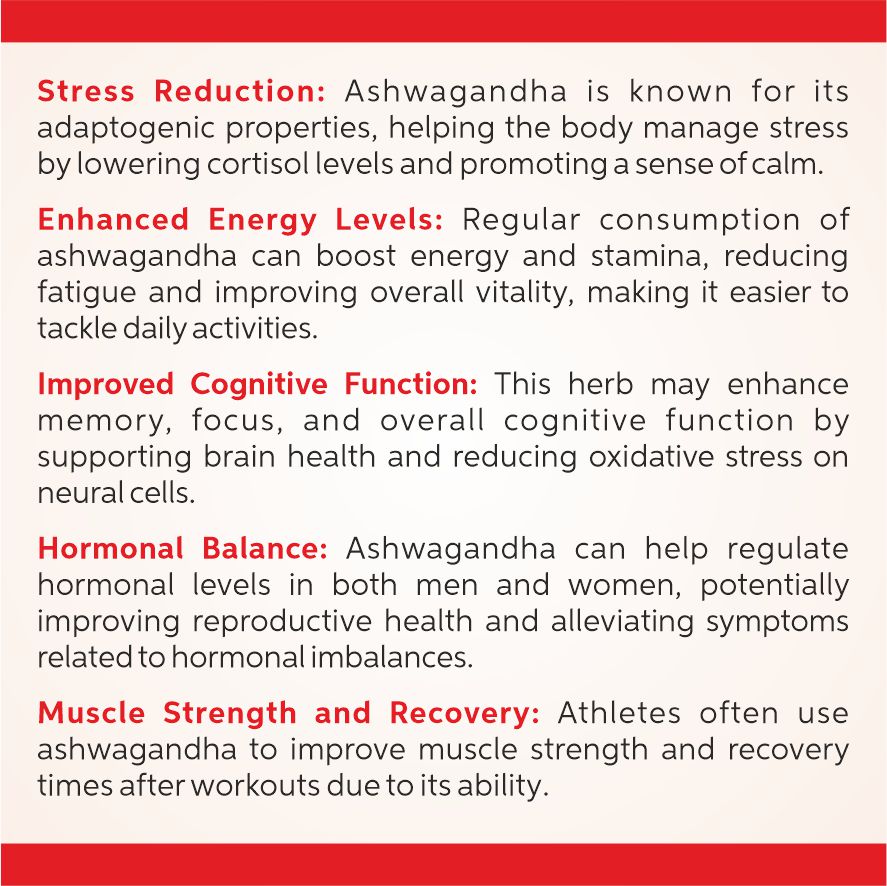 Hormonal Balance: Ashwagandha can help regulate hormonal levels in both men and women, potentially improving reproductive health and alleviating symptoms related to hormonal imbalances.
